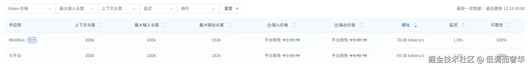 MiniMax-M2.1 的两家供应商官方、七牛云均支持 200k 上下文 / 输入长度、192k 输出长度,可靠性均为 100% 且当前享平台免费额度;其中 MiniMax 官方的吞吐更优(78.08 tokens/s)、延迟略低(1.09s),七牛云吞吐稍弱(69.56 tokens/s)、延迟微高(1.17s),二者性能差异较小,可按需切换。