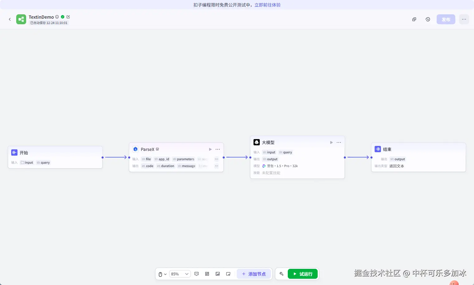 然后我们就先可以接入一个结束组件,点击试运行,试运行结束,可以看到ParseX插件成功解析了文件并且输出了对应的内容