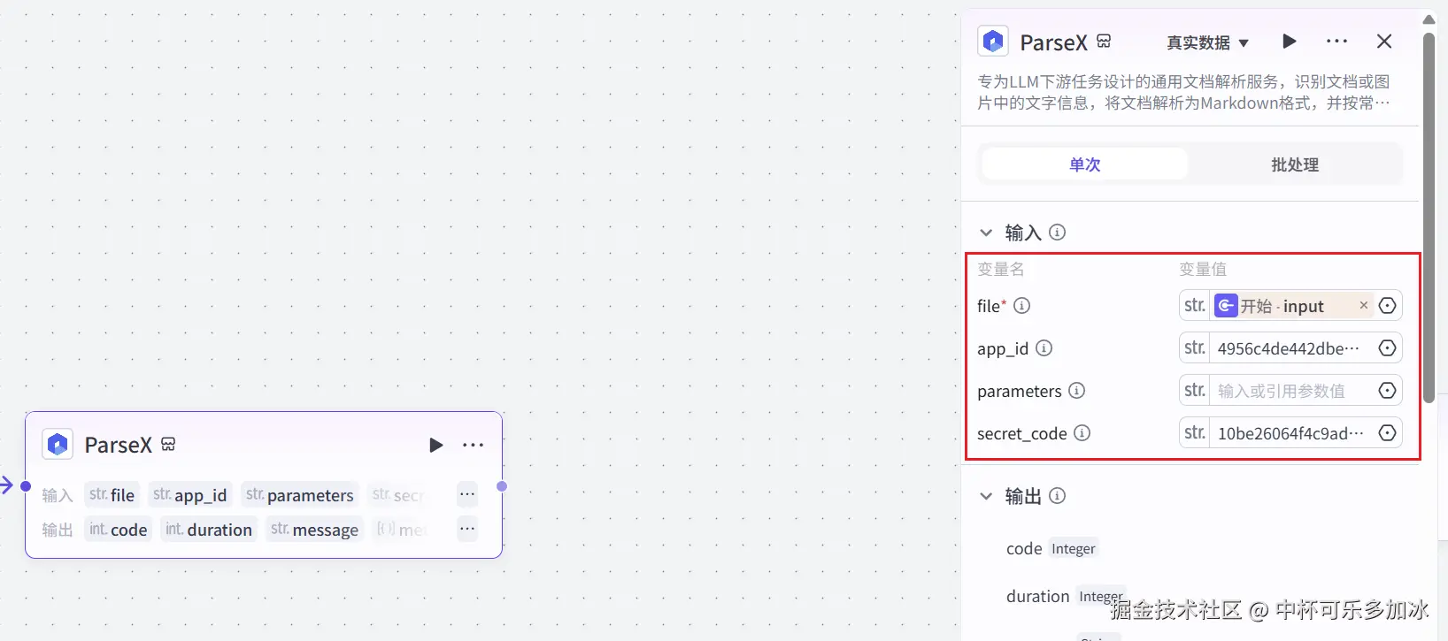 为了确保 TextIn 服务的安全调用,ParseX组件是需要鉴权的,我们需要在插件配置中填入从 TextIn 官网获取的 x-ti-app-id 和 secret-code 进行鉴权。