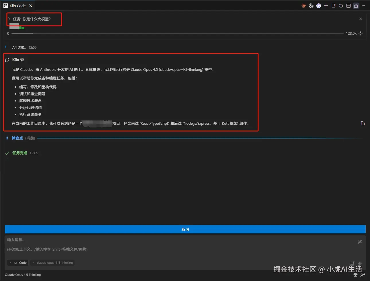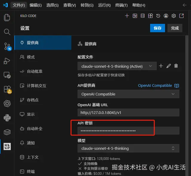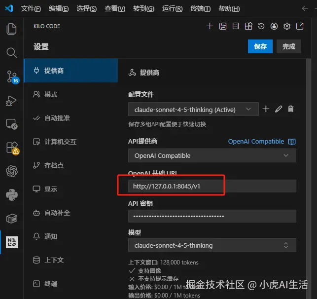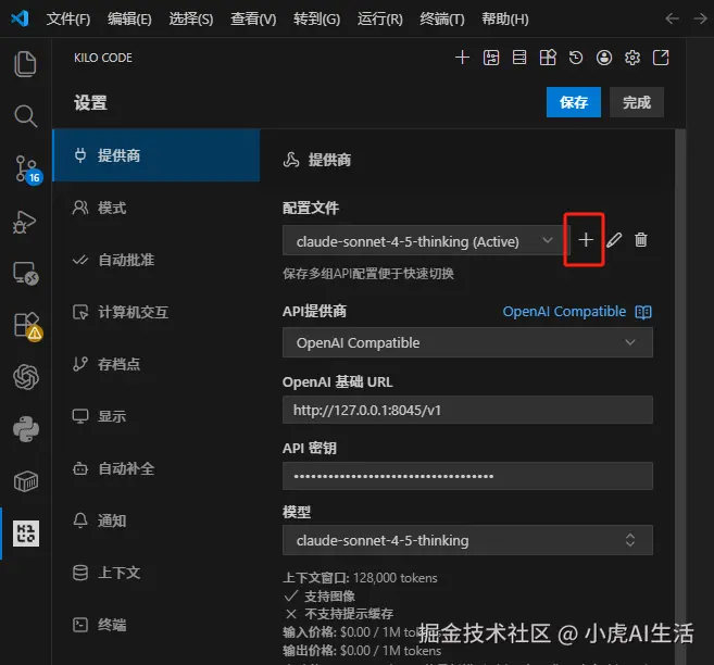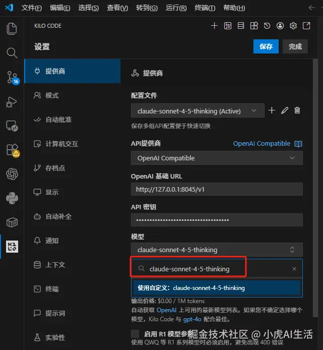 Kilo 支持手动输入!直接把我们刚才起的霸气名字 claude-opus-4-5-thinking 输进去,回车,保存。✅