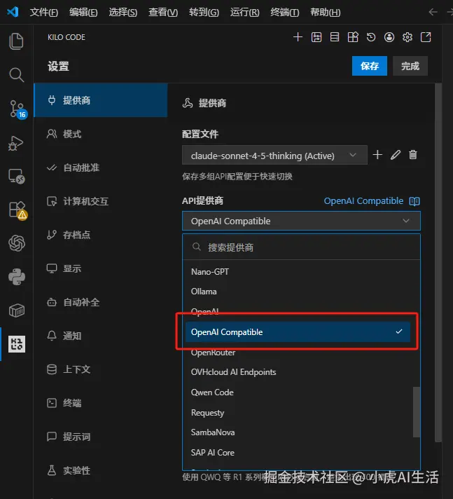 - 选择提供商:Provider 选择 OpenAI compatible。