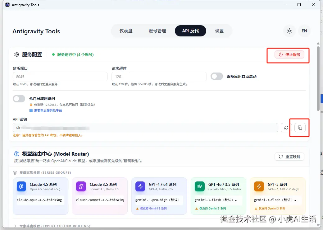 - 开启服务:最关键的一步,点开 API 反代,把服务跑起来。