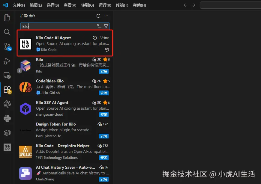 打开 VS Code,搜一下 Kilo,发现这不仅是个开源插件,还是完全免费的!这年头免费又好用的东西,必须冲!🚀