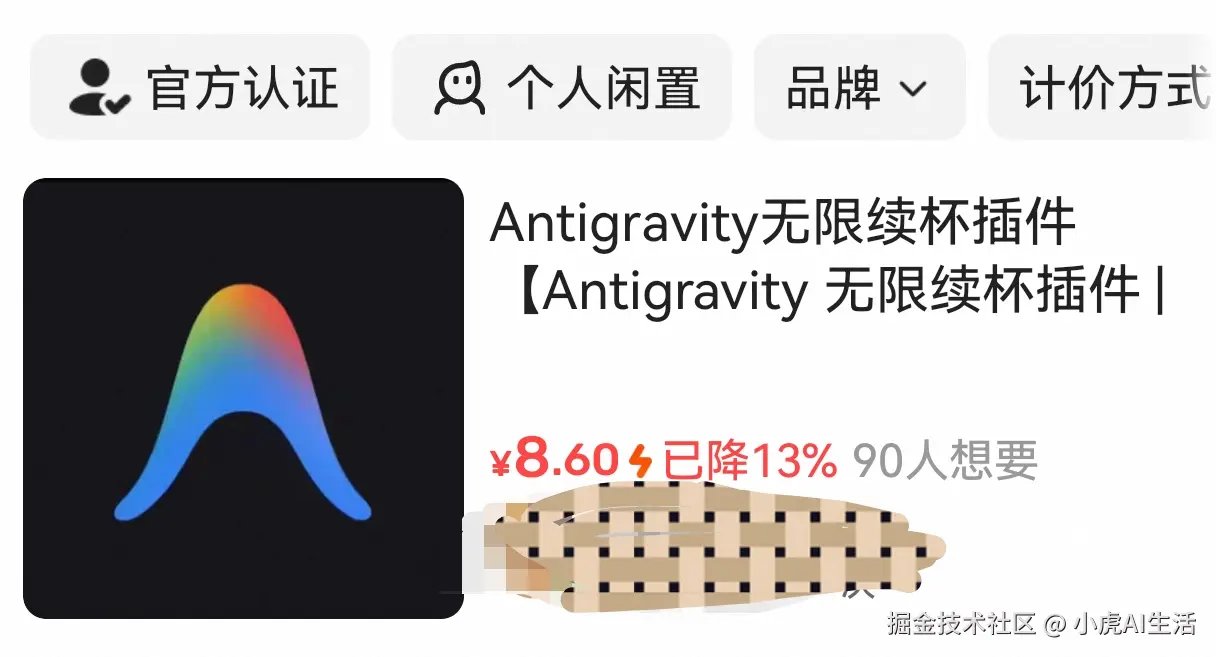 最近逛海鲜市场,无意间看到有人在卖 Antigravity(简称 ag)的“无限续杯”插件。企业版几块钱,个人版二十多。