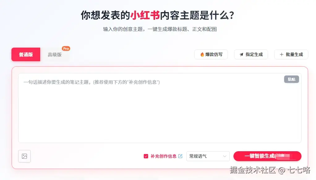 找到爆款方向后,内容创作就是下一个核心难题。不少博主卡在文案撰写环节,要么写出来的内容干巴巴没吸引力,要么反复修改还是不符合平台调性。这时候火兔工具箱就能派上大用场,它的一键生成功能可以根据你选定的爆款选题,快速生成符合小红书风格的文案初稿,不管是种草笔记的“痛点+解决方案”结构,还是干货笔记的“分点科普”形式,都能精准匹配。而且生成的文案还自带网感语气,不用你再逐字修改,大大提升创作效率。