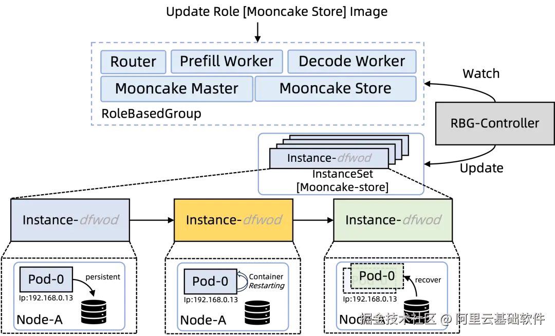- RBG 原地升级:通过 RBG 的精细化角色控制能力,在升级 Mooncake 角色时避免重建 Pod,而是原地替换容器镜像并复用节点的本地盘或共享内存,从而保留已持久化的缓存数据,实现“无缝”版本切换。