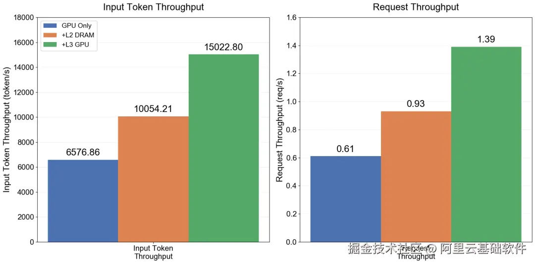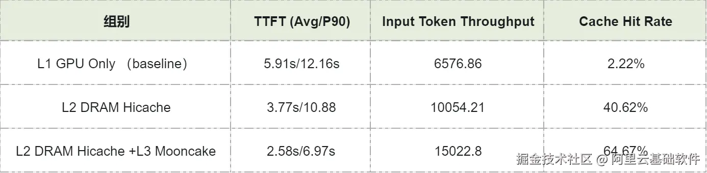 - L2 DRAM HiCache: 命中率提升至 40.62% ,平均 TTFT 降至 3.77s(↓36.2%) ,P90 降至 10.88s,InputToken 吞吐提升至 10054.21 token/s(↑52.89%)。