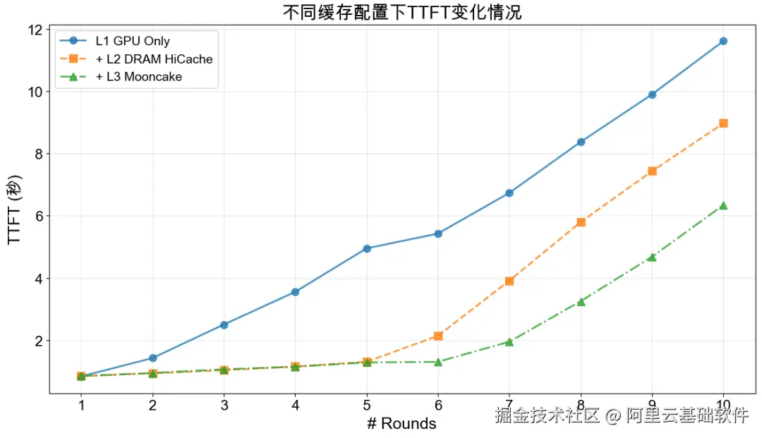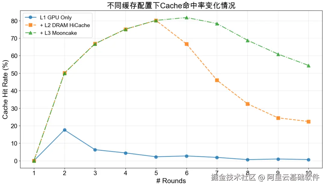 多轮对话场景测试表明,多级缓存架构对 KVCache 命中率与推理性能提升至关重要: