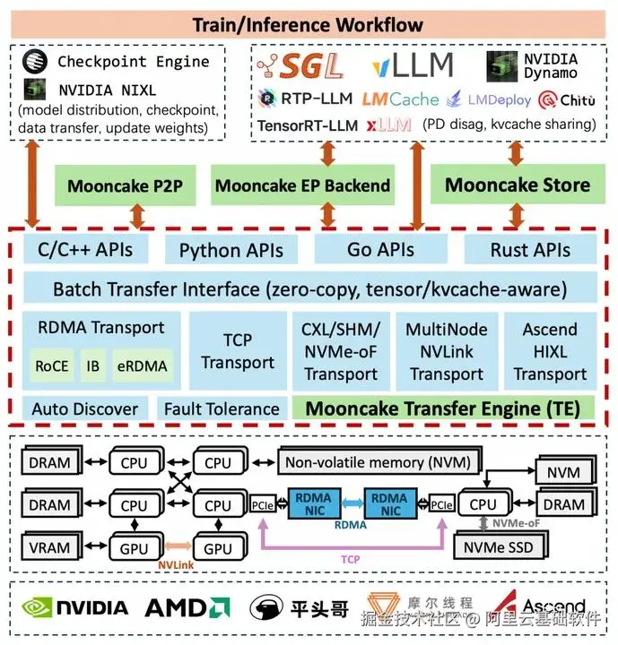 Mooncake 作为业界主流的分布式 KVCache 存储引擎,正是为应对这一挑战而生。它通过专用缓存集群为 SGLang 等推理框架提供高吞吐、低延迟的 KVCache 分布式服务。