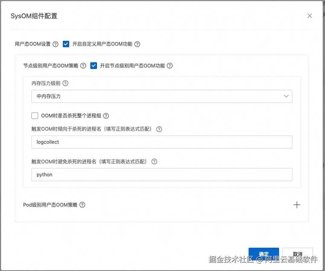 通过配置开启节点级别的 FastOOM 功能,由于业务是实验较为敏感的业务,内存压力选择中,且设置业务程序(以 python 启动,进程名包含 python 子串)为避免被 OOM 进程且设置无关的日志程序优先杀死。