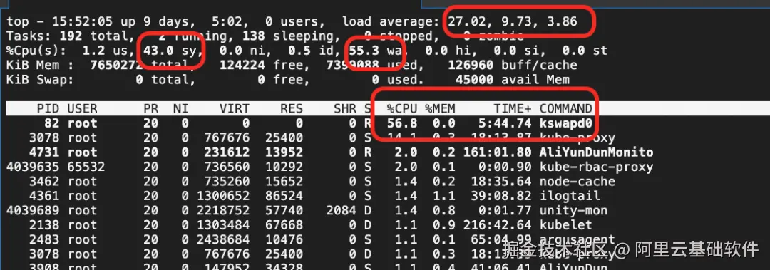 通过 top 命令可以看到系统的 CPU sys 利用率和 iowait 利用率和系统负载都持续飙高,kswapd0 线程占用非常高的 CPU 进行内存回收。