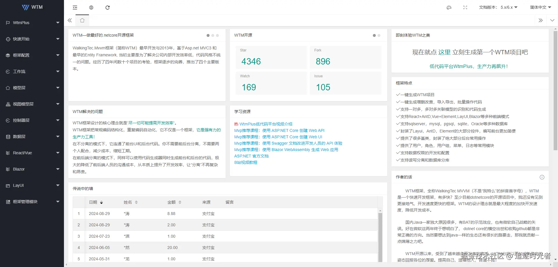 WalkingTec.Mvvm框架(简称WTM)是基于.net core的快速开发框架。支持Layui(前后端不分离), React(前后端分离),VUE(前后端分离),内置代码生成器,最大程度的提高开发效率,是一款高效开发的利器。