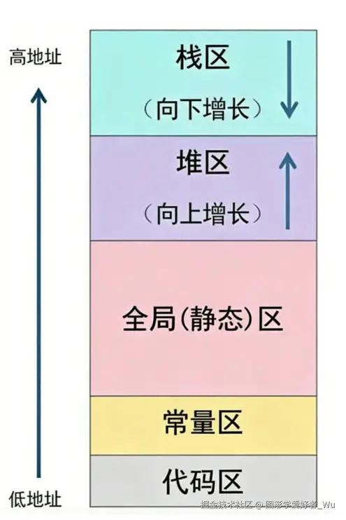 其中,栈区主要用来存储局部变量;堆区主要用于存储动态数组、对象;全局/静态区是专门存储全局变量和静态变量的区域;常量区是存储字符串常量的区域;代码区是存储程序的二进制执行代码的区域