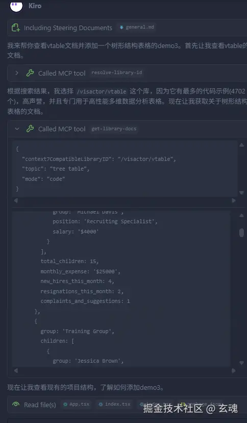 可以看到已经成功调用mcp工具去获取文档信息了。我要求他实现一个树形表格。