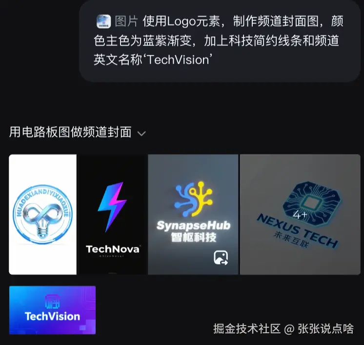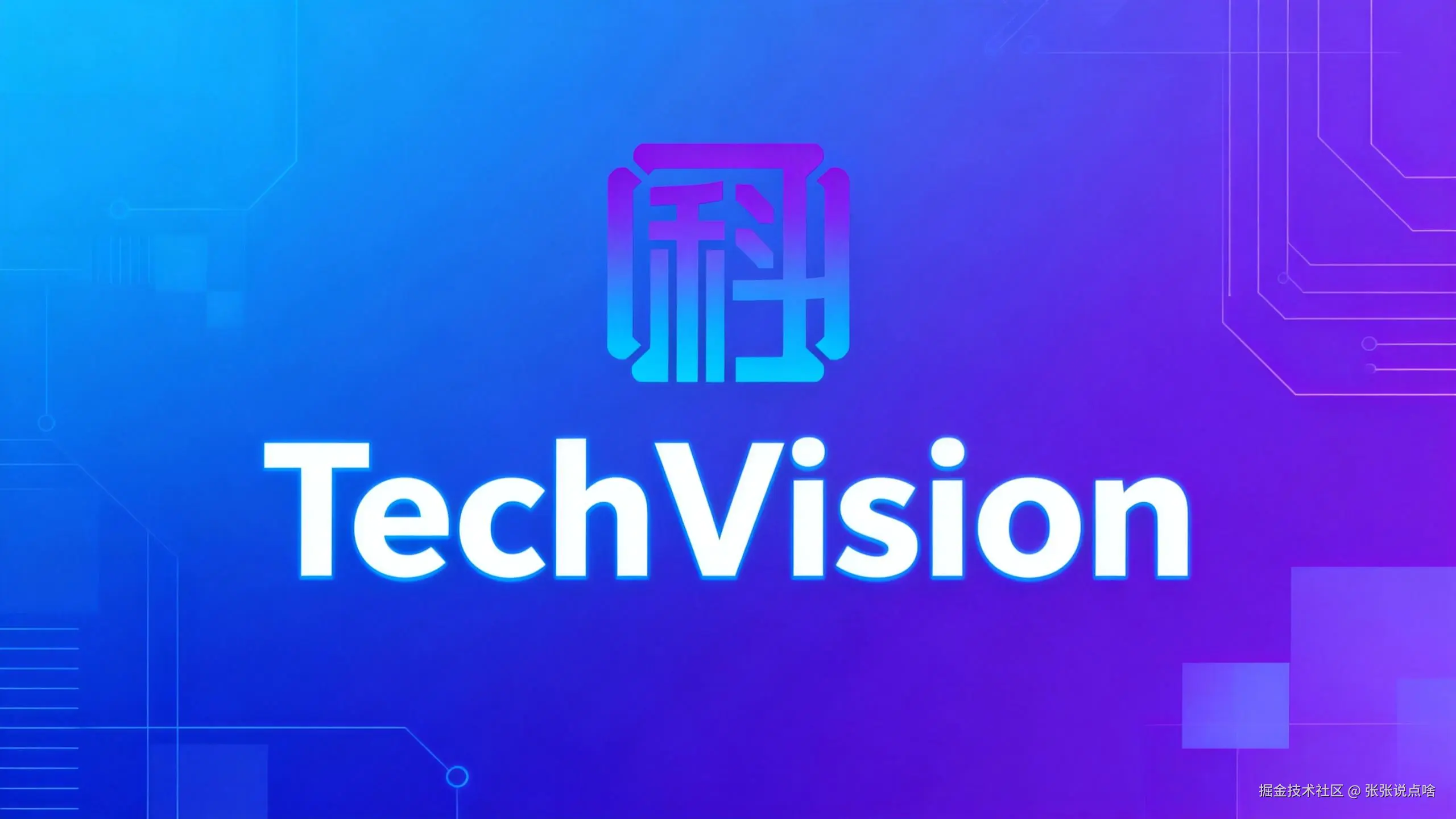 “使用Logo元素,制作频道封面图,颜色主色为蓝紫渐变,加上科技简约线条和频道英文名称‘TechVision’”