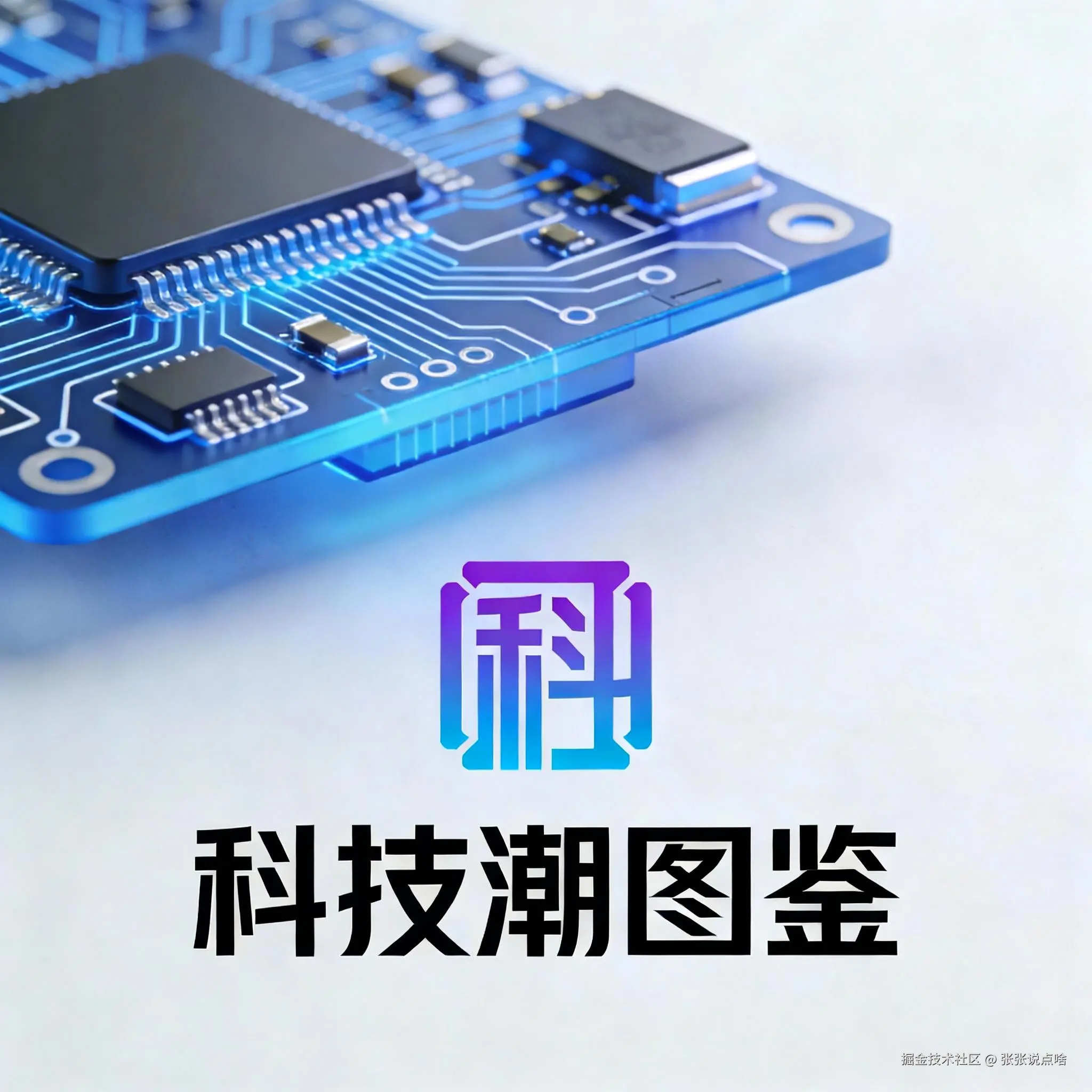 科技企业LOGO,电路图腾微型设计,蓝色/紫色渐变主色,LOGO占比15%,底部"科技潮图鉴"极简科技感 Logo,关键词:芯片、未来感、