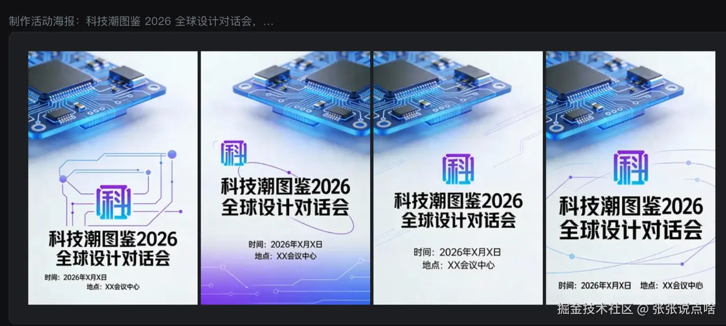 “活动海报:科技潮图鉴 2026 全球设计对话会,时间 XX、地点 XX,视觉保持Logo风格、蓝紫渐变、简约未来科技线条”