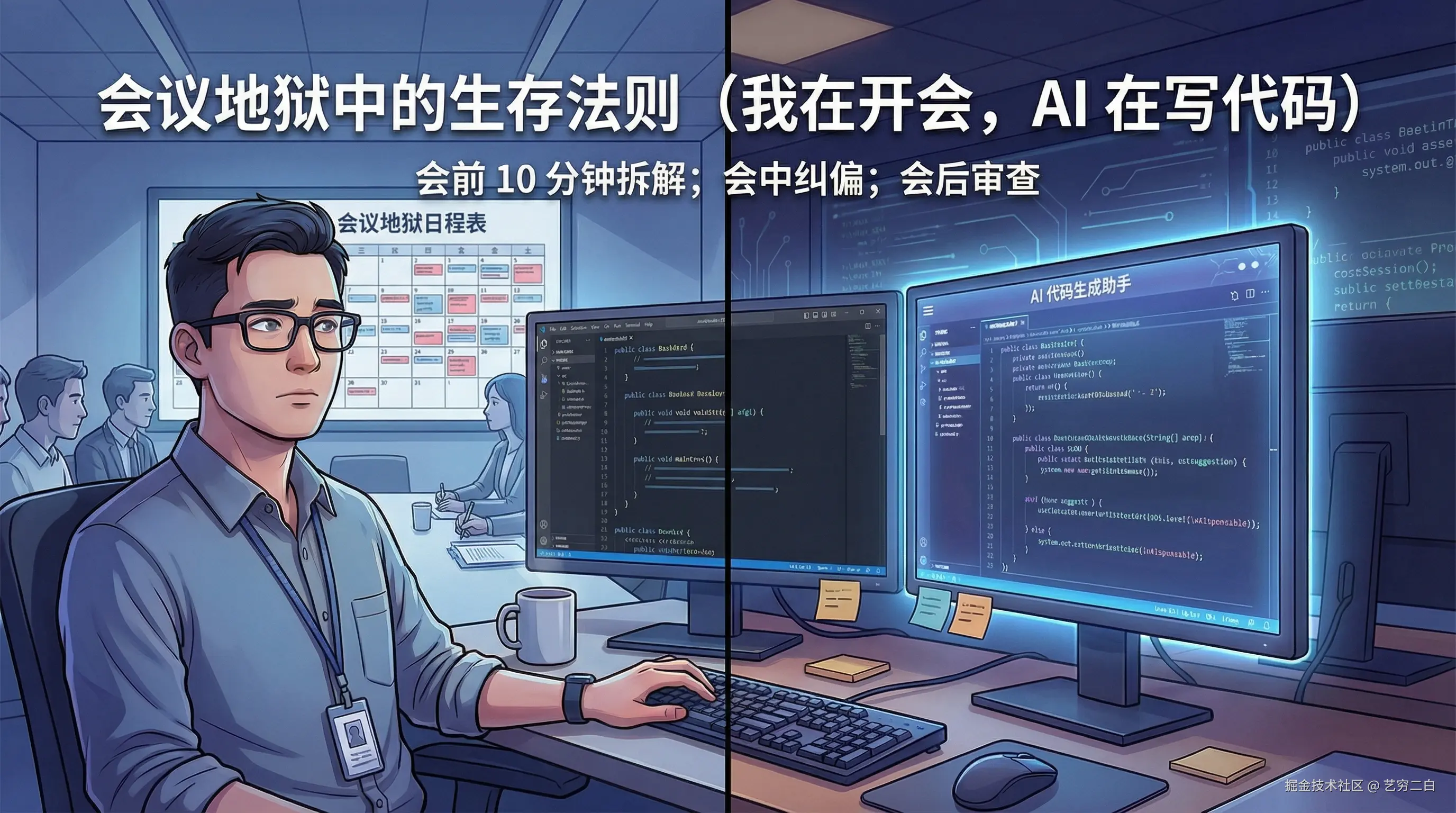 现在我会在开会前花10分钟,把任务拆解清楚,写好prompt,让AI开始干活。然后我去开会。会议间隙瞄一眼进度,发现跑偏了就调整一下方向。会议结束回来,初版代码已经生成好了,我只需要review和调整。