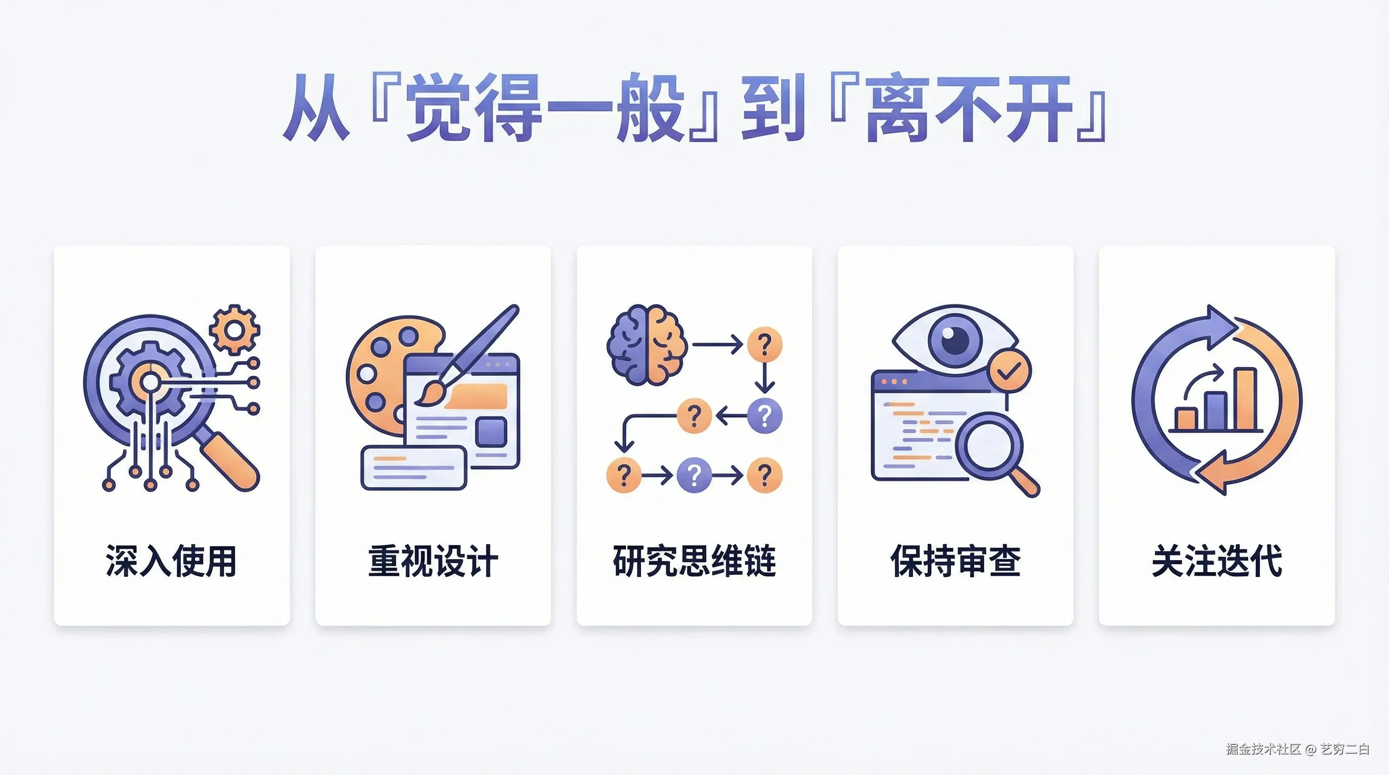 **关注模型迭代:**AI能力在快速进化,半年前不能做的事,现在可能已经能做了。保持关注,保持学习。