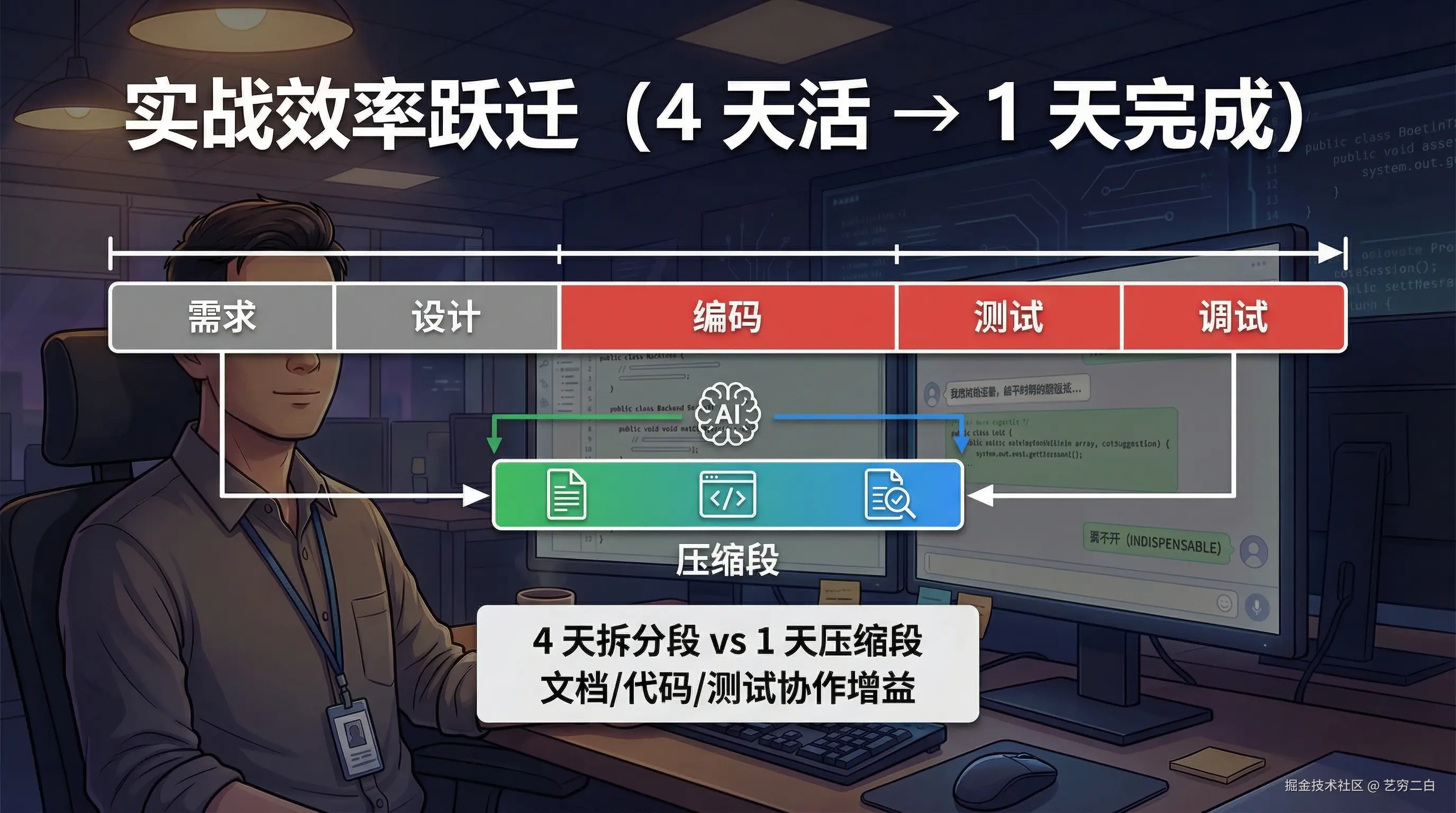 关键变化在于:AI辅助我完成技术方案设计,我说思路,它帮我补充细节、画流程图、写文档;基于设计文档,AI生成核心代码和单元测试,有些边界情况我没想到,AI提醒了我,有些我平时"偷懒不想写"的防御性代码,AI也都补上了。