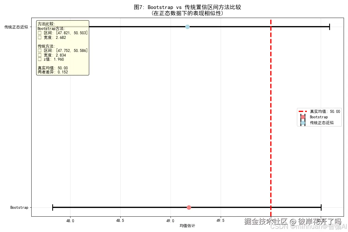 print(f" 区间宽度差异: {abs((bootstrap_ci_upper-bootstrap_ci_lower) - (traditional_ci_upper-traditional_ci_lower)):.3f}")