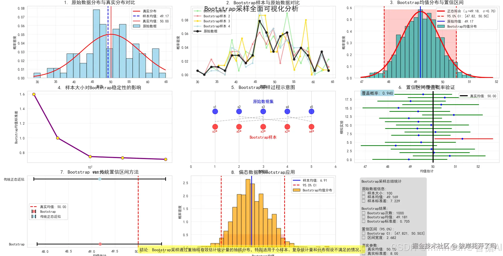 这8张图片系统地展示了Bootstrap采样的各个方面: