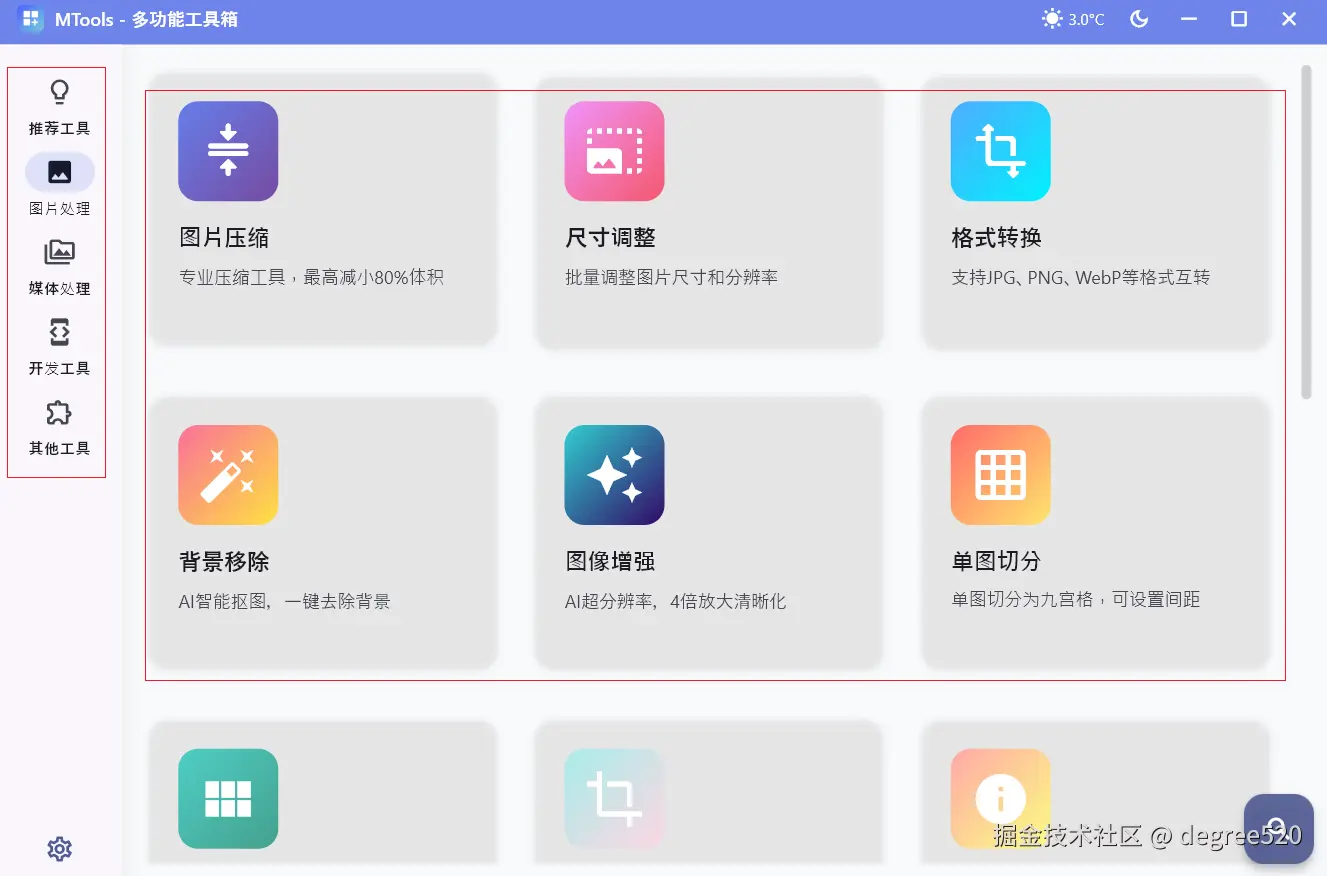 解压后双击 exe 直接运行,首页四大板块——图片处理、媒体处理、开发工具、其他工具,无广告,打开即用。