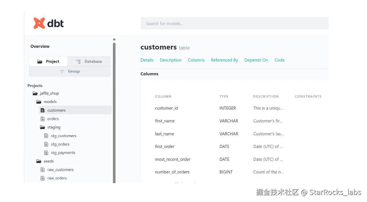 在文档与资产管理层面,dbt 还可以自动生成数据字典等文档资产。通过 dbt 生成的 HTML 文档,团队可以查询各类字段的定义和含义,查看对应的代码实现以及上下游依赖关系(dependencies),并且可以根据企业品牌规范自定义 Logo 和展示样式。