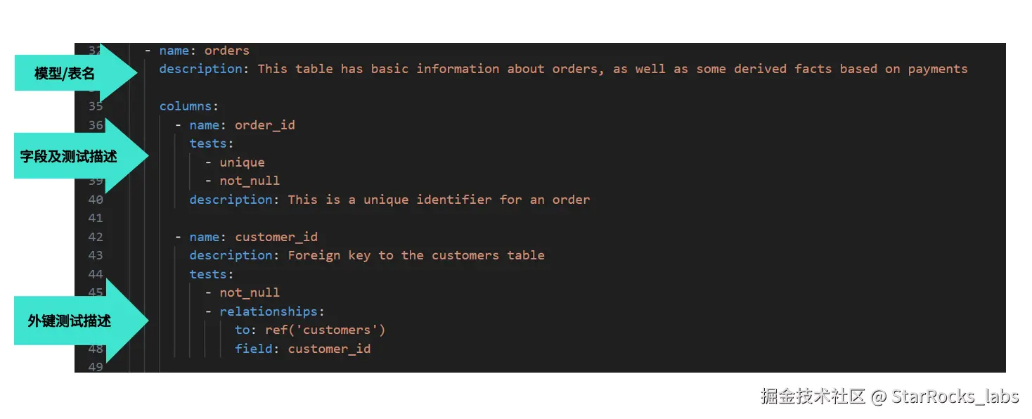 在具体实现上,dbt 的模型描述文件通常采用 YAML 格式编写。每个模型会定义名称(name)和描述信息(description),用于说明该模型的用途与业务含义;在此之下则是字段级的配置。针对字段,dbt 内置了多种测试工具,例如 unique、not_null 等,可用于校验字段是否唯一、是否存在空值等基础质量规则。