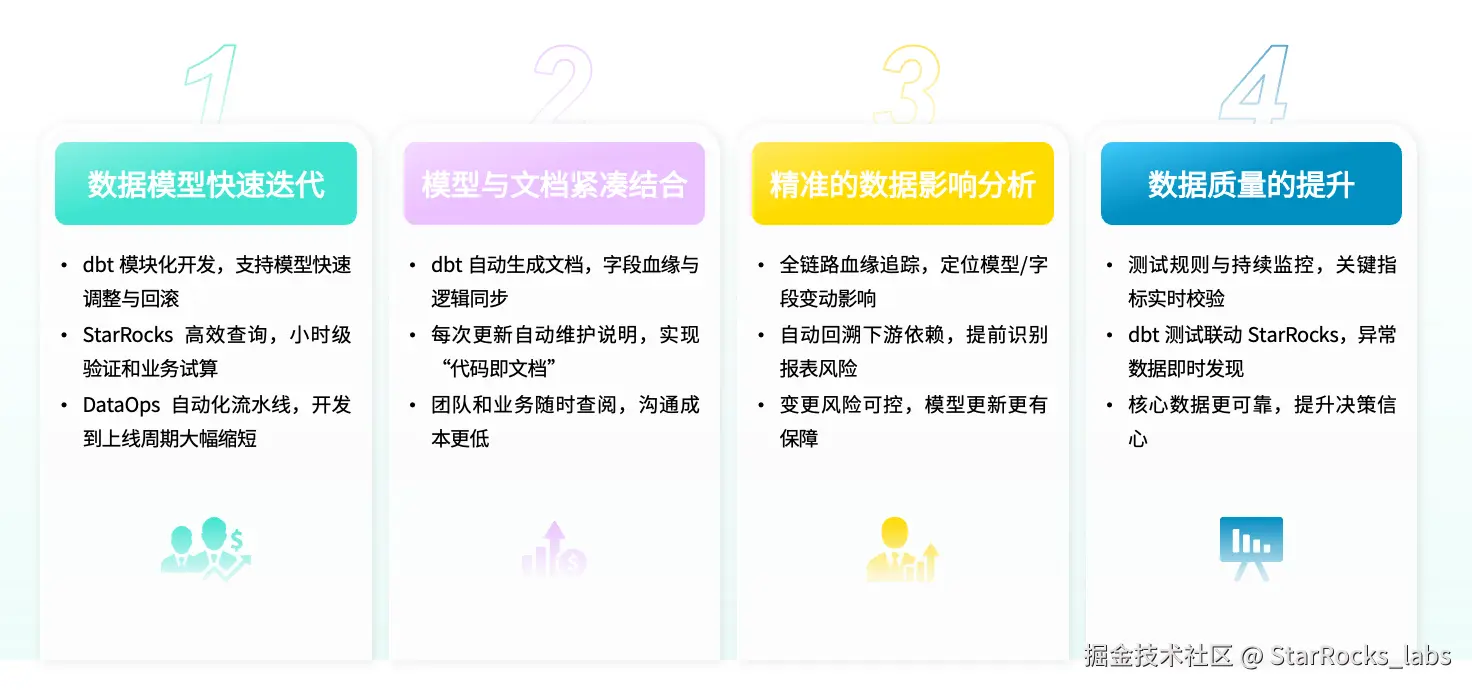 在此基础上,通过 dbt + DataOps + StarRocks 构建的“三合一”数据体系,为企业带来了以下几方面的直接收益: