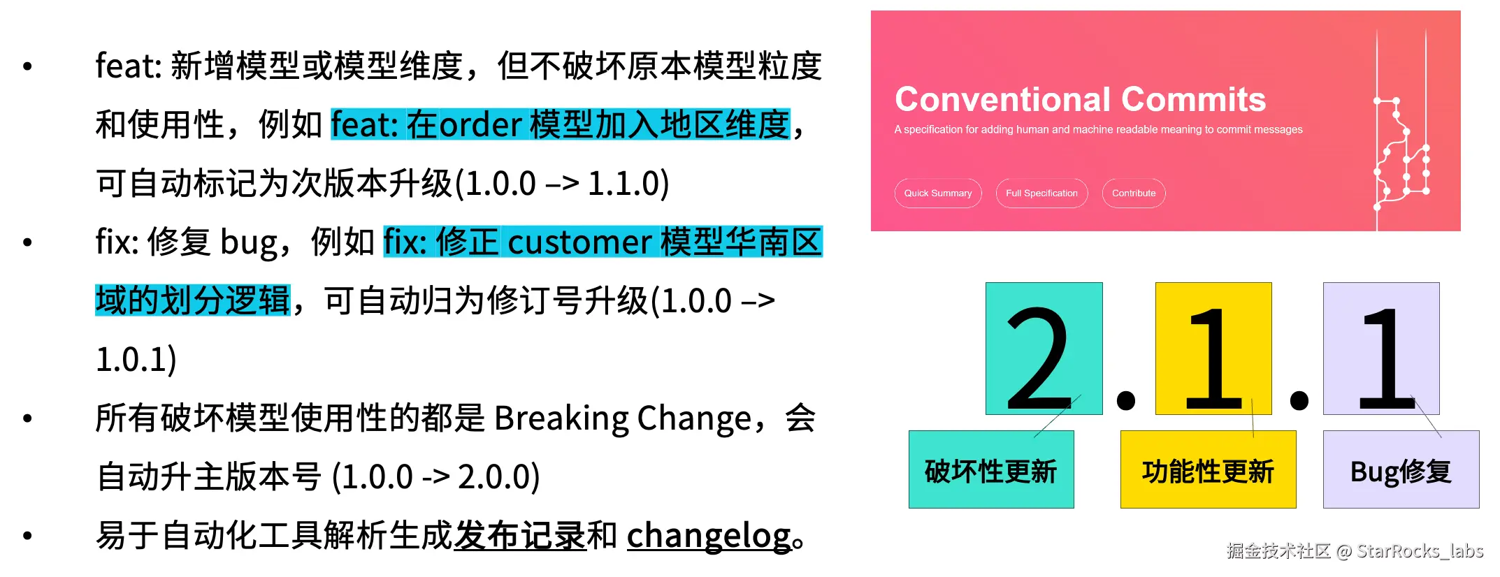 以一个具体示例来说明:如果某次变更属于功能性更新,例如在 order 模型中新增了一个维度字段,那么对应的版本号会在中间位上递增,例如从 2.0 升级到 2.1,此类变更通常保持向后兼容(backward compatibility);而针对缺陷修复(bug fix),则只会提升尾号,例如从 2.1.0 升级到 2.1.1。