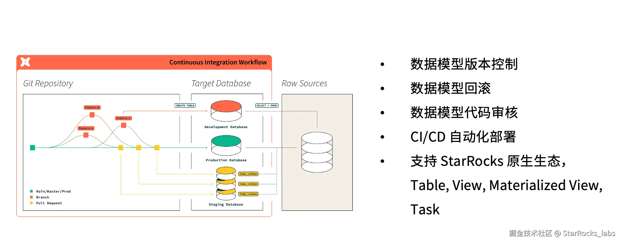 在具体实践中,通常会维护多个 feature branch,在分支合并的过程中自动触发测试;当代码进入 staging 环境后,再通过 CICD 工具,将任务发布到 production 环境。这样一套流程的直接收益,是数据模型可以像应用代码一样进行版本控制。