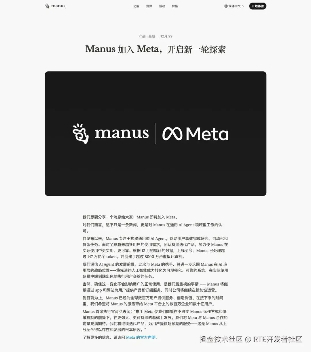 1、Meta 斥资数十亿美元收购 Manus,创始人肖弘出任 Meta 副总裁