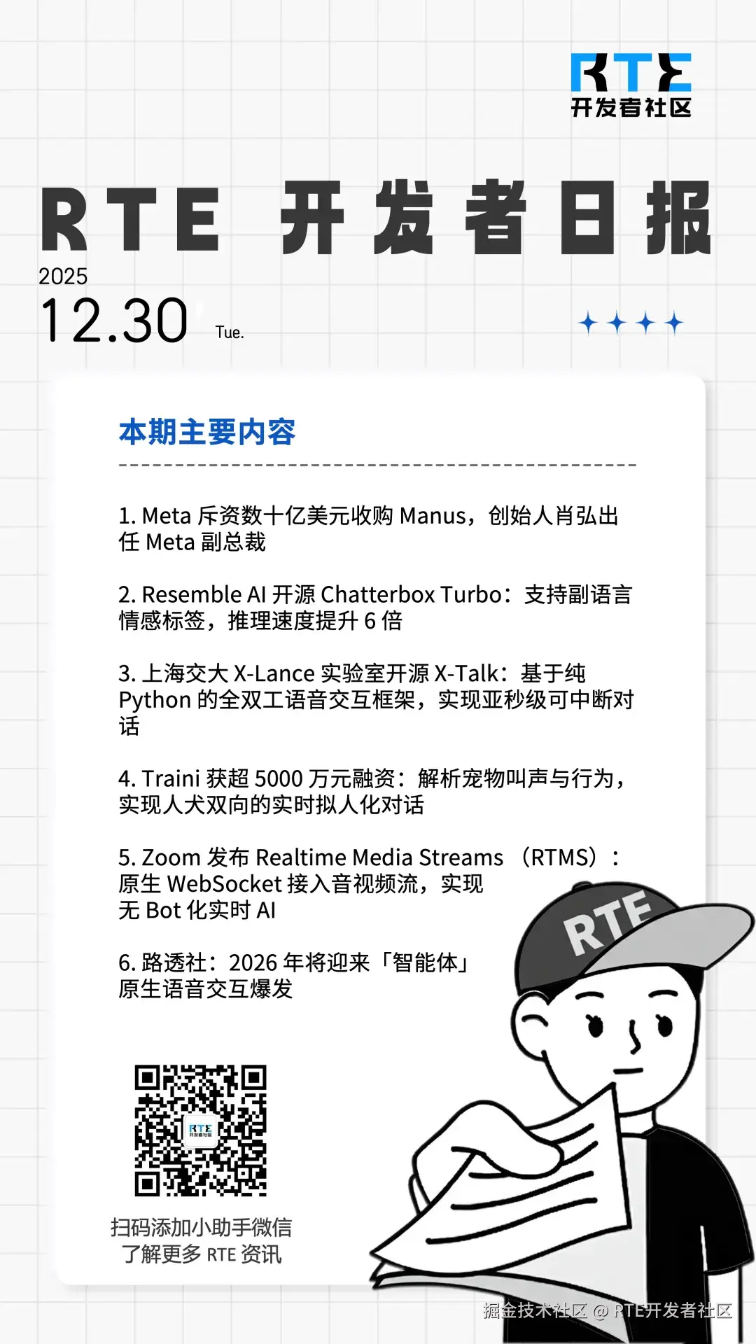 这里是 「RTE 开发者日报」 ,每天和大家一起看新闻、聊八卦。我们的社区编辑团队会整理分享 RTE(Real-Time Engagement) 领域内「有话题的技术」、「有亮点的产品」、「有思考的文章」、「有态度的观点」、「有看点的活动」,但内容仅代表编辑的个人观点,欢迎大家留言、跟帖、讨论。