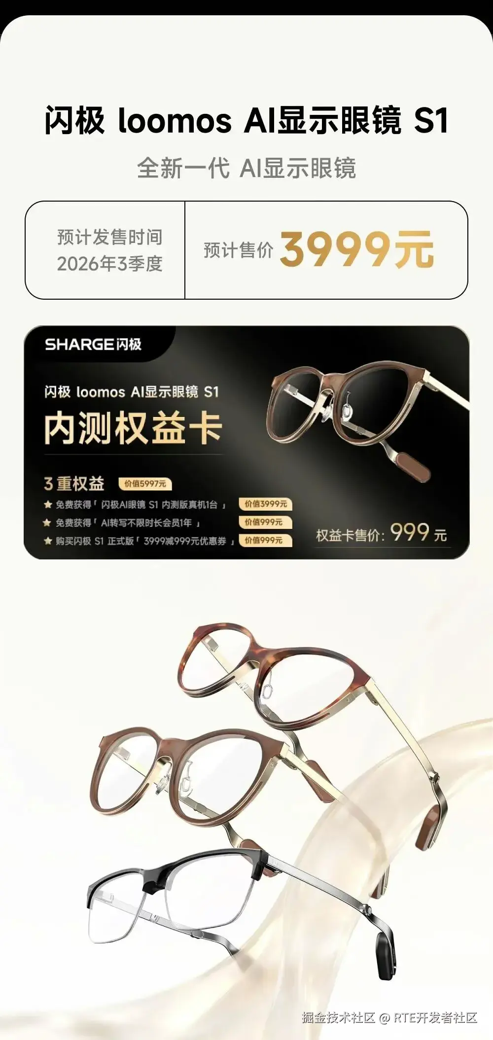 2、3999 元!闪极 loomos AI 眼镜 S1 发布:整机 29 克全球最轻