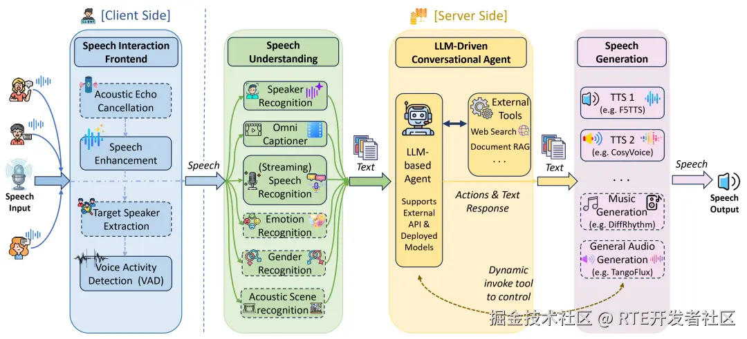 生产级 API 与部署: 采用后端纯 Python + 前端 WebSocket 的通信方案,兼容从 Web 浏览器到边缘设备的部署场景。深度集成 LangChain 框架,支持「智能体」在对话中调用网页搜索、本地检索及情感/音色控制工具。
