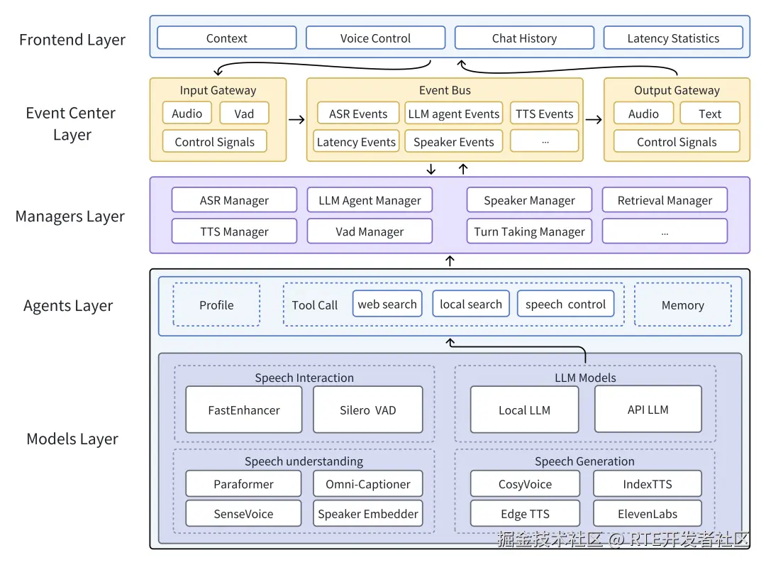 异步事件总线架构: 核心基于 Event Bus 实现 ASR、LLM、TTS 及 VAD 模块的松耦合通信,所有图层通过异步发布/订阅模式交互,支持复杂的对话状态管理与流式数据并发处理。