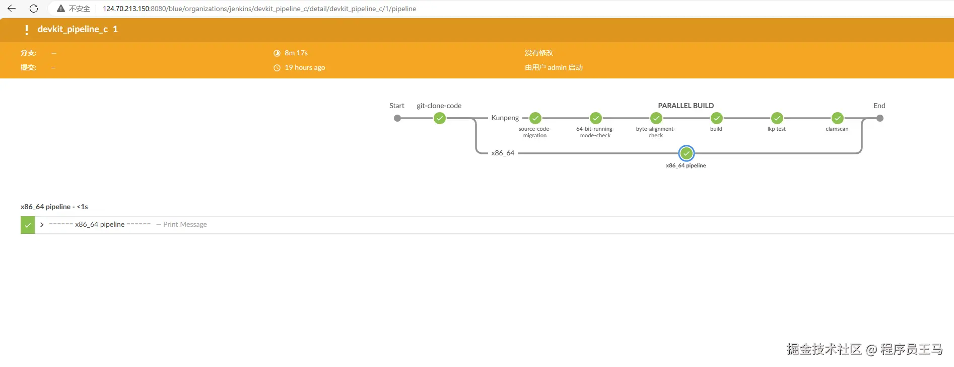 最关键的是,我配置了一条 并行流水线:一边模拟 x86 构建(仅输出日志),另一边在鲲鹏节点上执行完整的检查与构建流程。