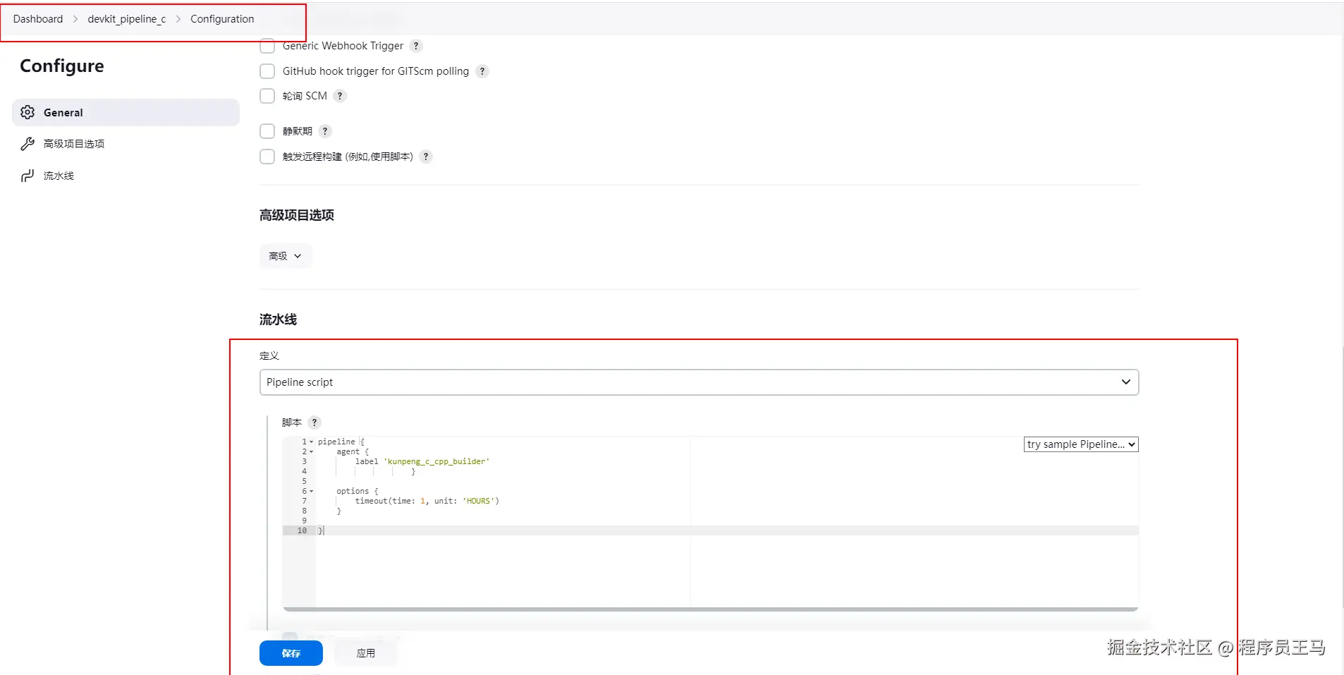 进入配置页面后,在 Pipeline script 中编写脚本,并拉取示例项目: