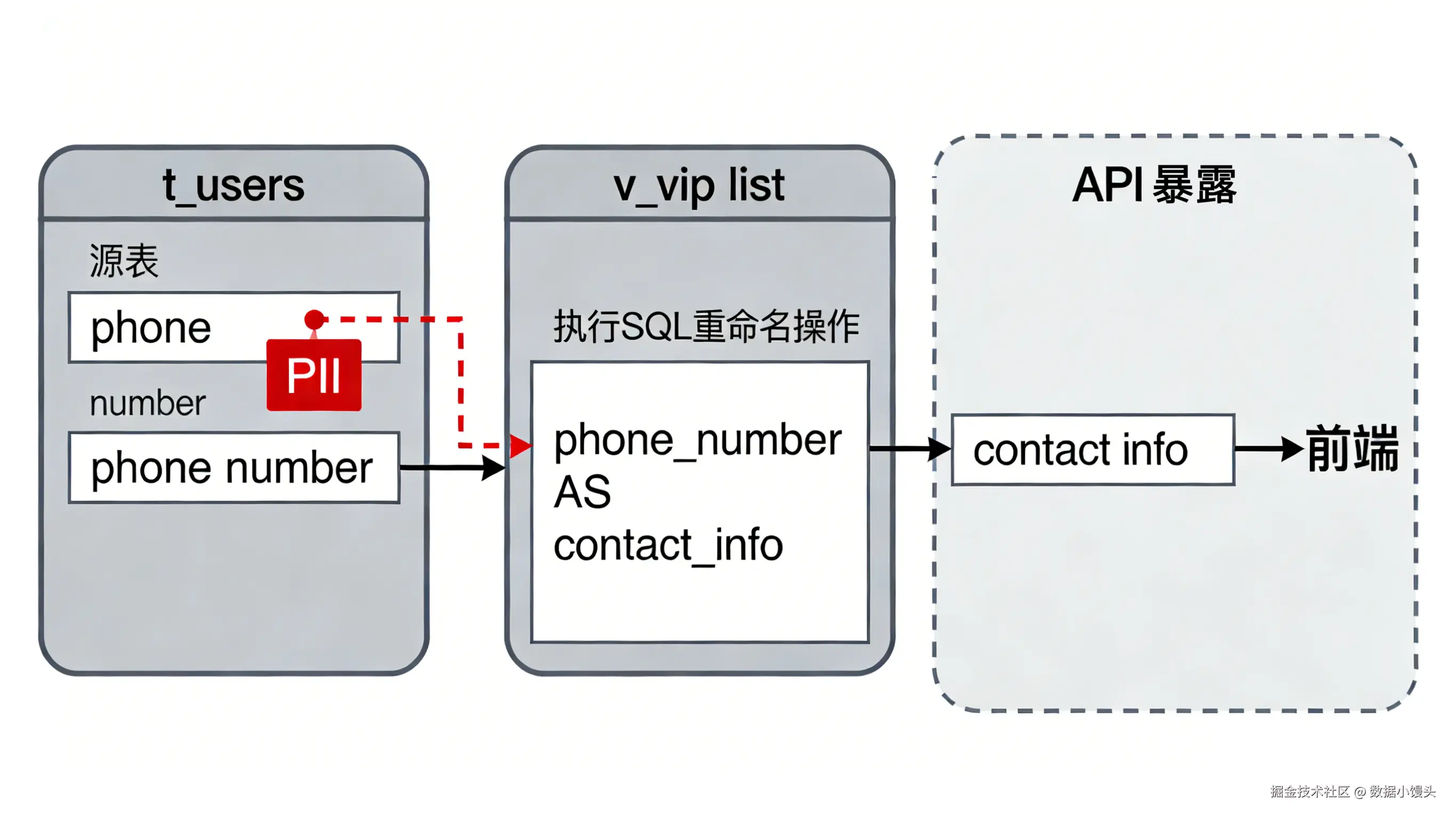 - 加工: 业务人员为了方便,创建了一个视图 v_vip_list,执行了 SQL:SELECT phone_number AS contact_info FROM t_users。
