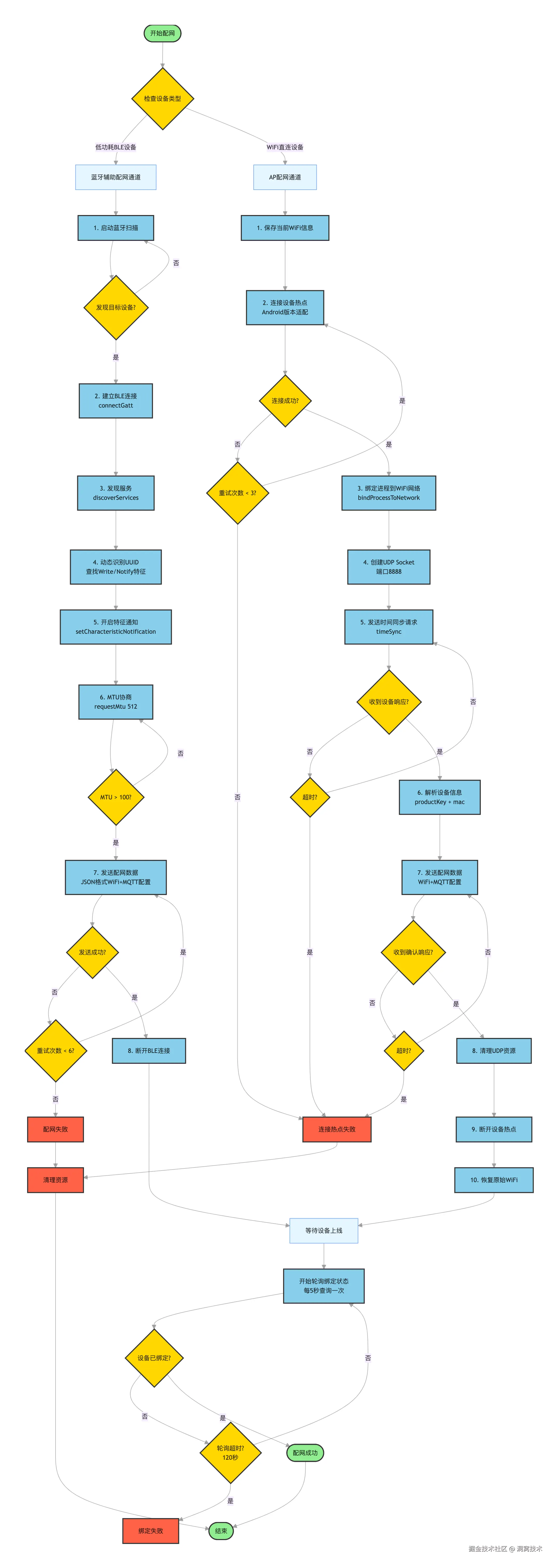 - 蓝牙配网通道: 蓝牙扫描 → BLE连接 → 服务发现 → UUID识别 → MTU协商 → 发送配网数据 → 断开连接 → 等待上线