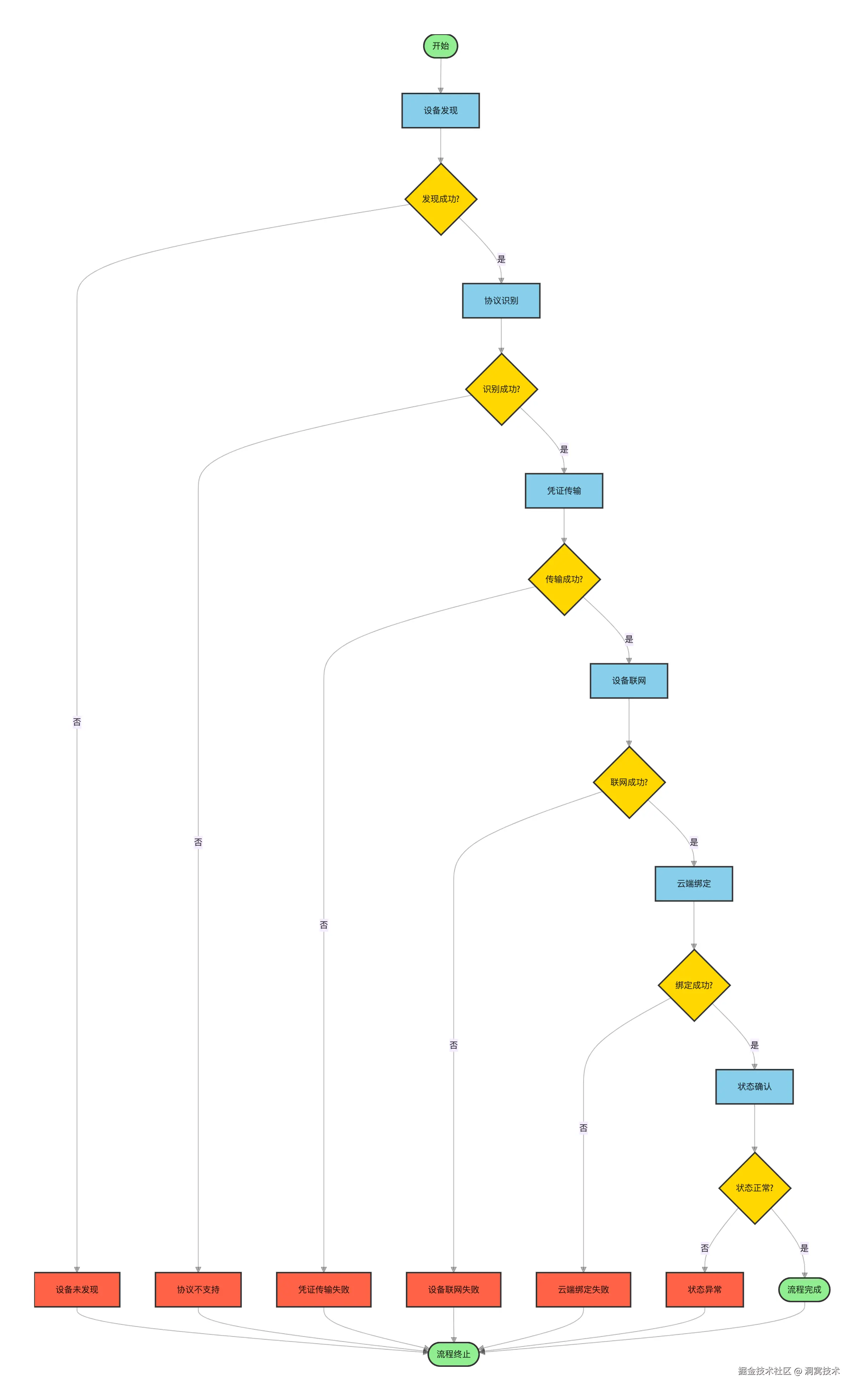 核心流程: 设备发现 → 协议识别 → 凭证传输 → 设备联网 → 云端绑定 → 状态确认