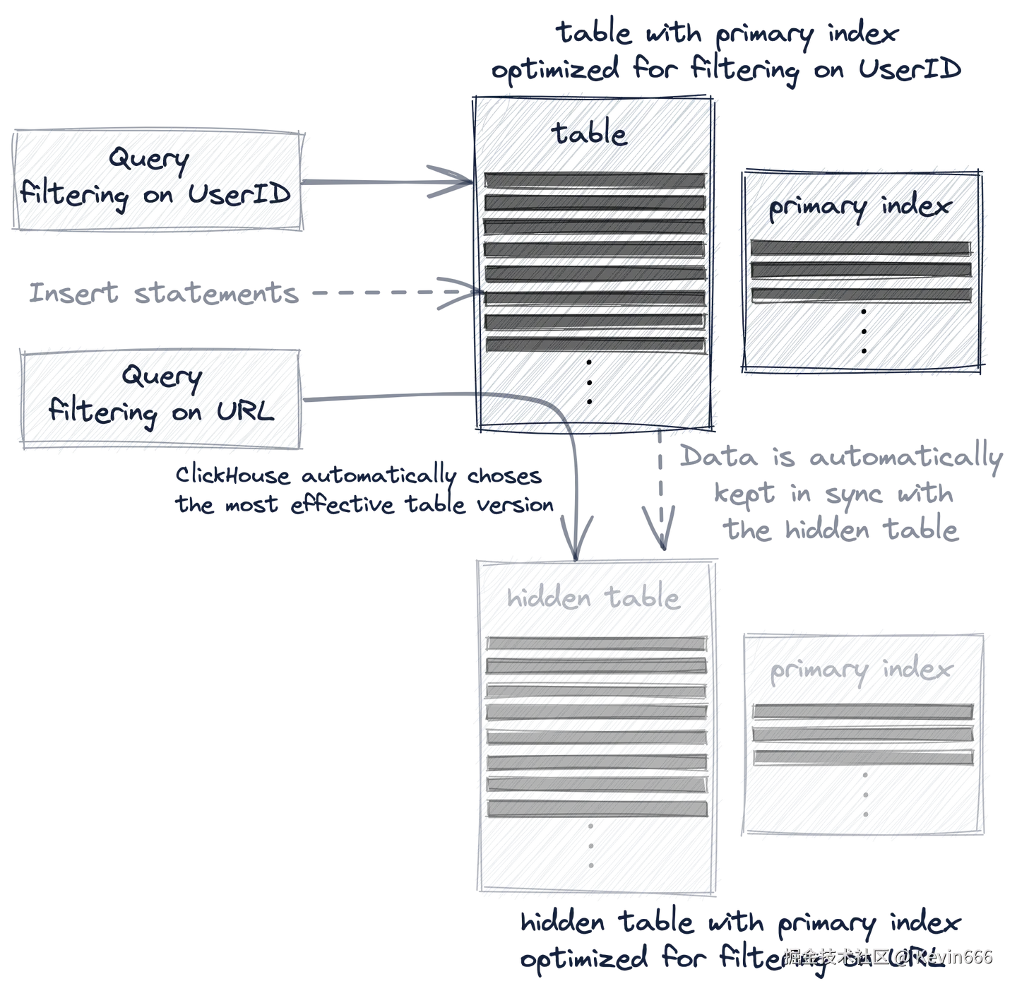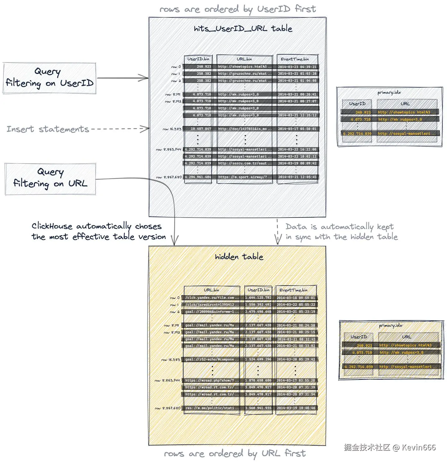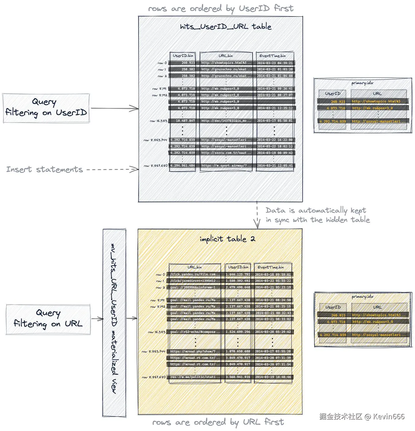 查询总是(从语法上)针对源表hits_UserID_URL,但是如果隐藏表的行顺序和主索引允许更有效地执行查询,那么将使用该隐藏表