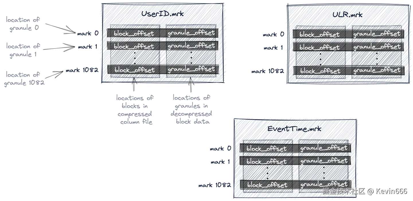 ClickHouse将隐藏表的列数据文件(.bin)、标记文件(.mrk2)和主索引(primary.idx)存储在ClickHouse服务器的数据目录的一个特殊文件夹中: