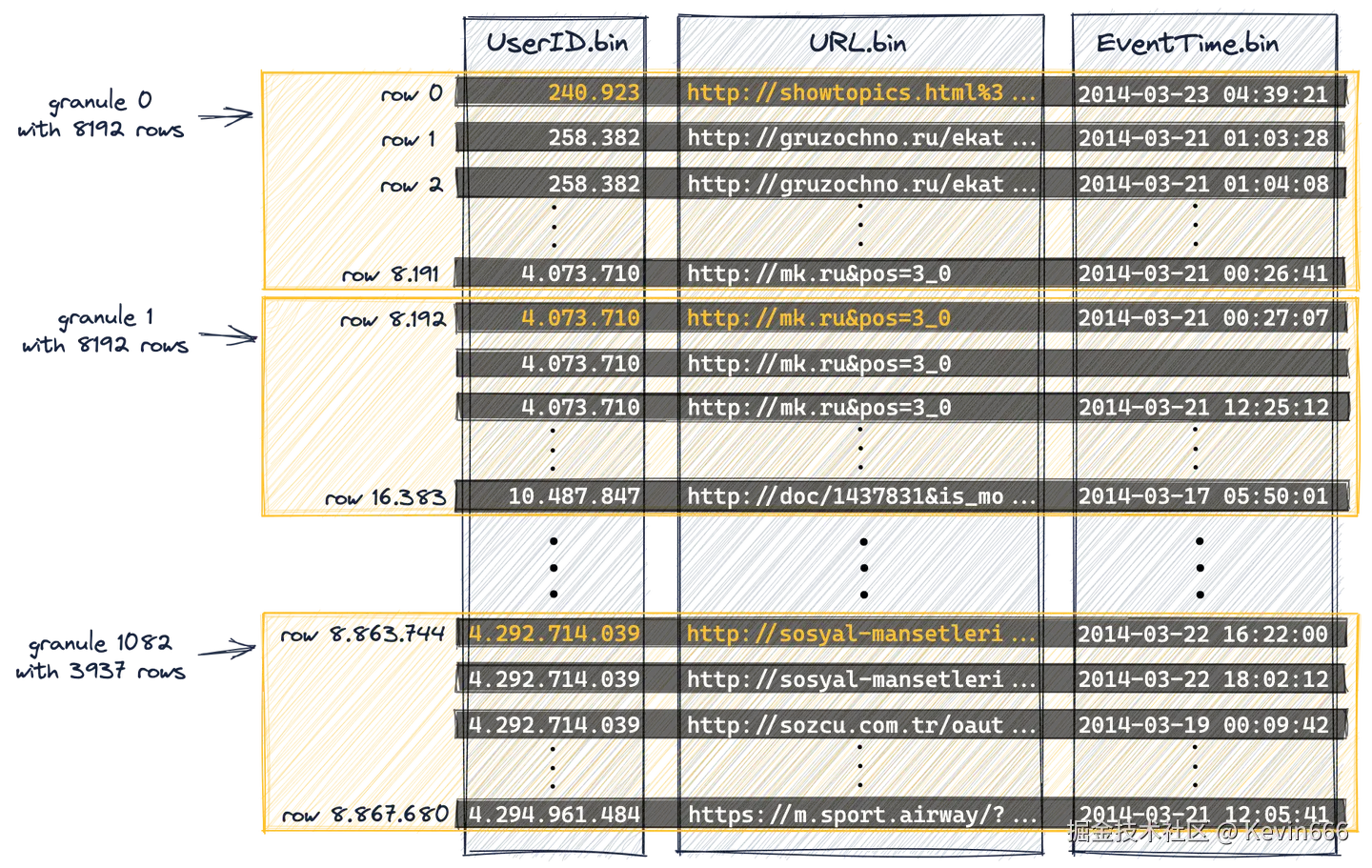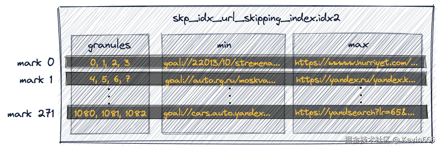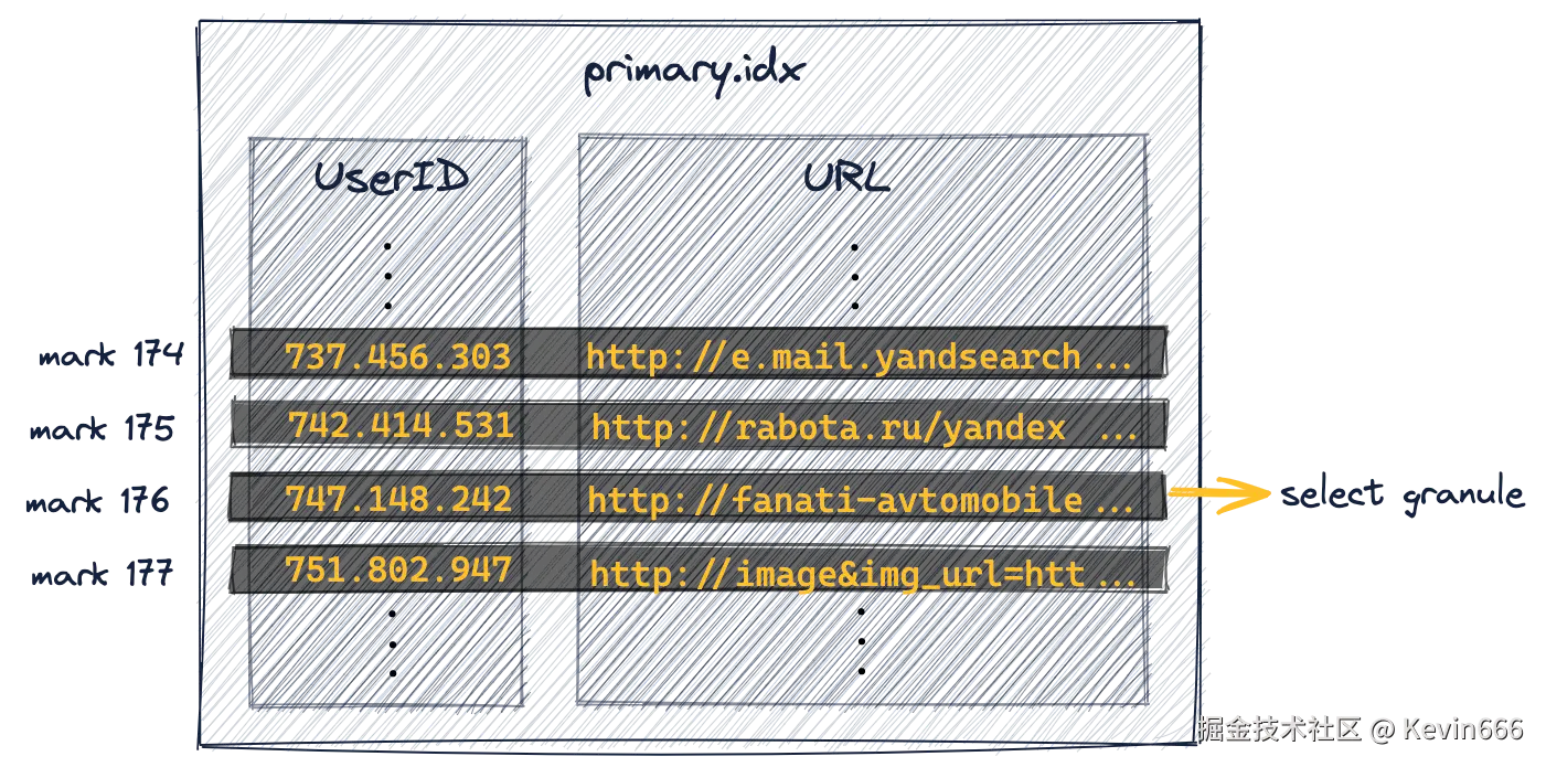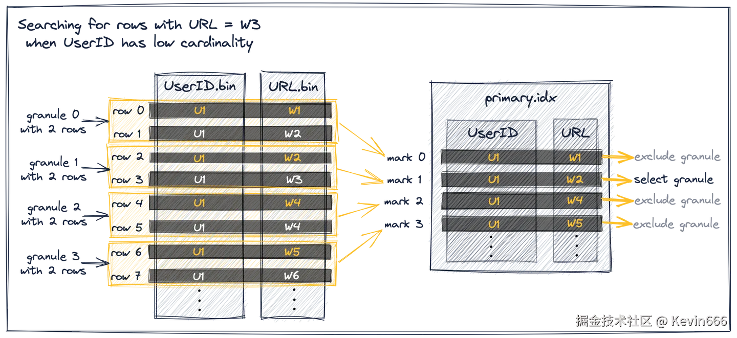 对于原始表中的主索引(其中UserID是第一个键列,URL是第二个键列),ClickHouse在索引标记上使用了通用排除搜索来执行该查询,但这不是很有效,因为UserID和URL的基数同样很高。