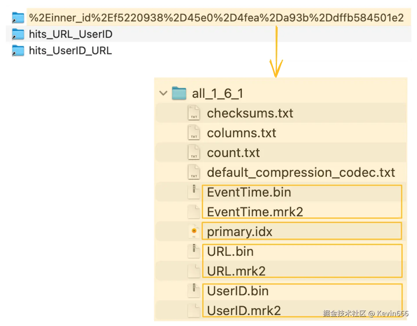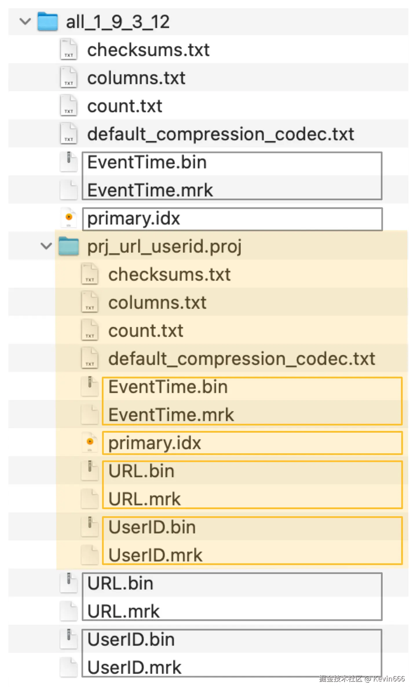 ClickHouse将隐藏表的列数据文件(.bin)、标记文件(.mrk2)和主索引(primary.idx)存储在一个特殊的文件夹中(在下面的截图中用橙色标记),紧挨着源表的数据文件、标记文件和主索引文件: