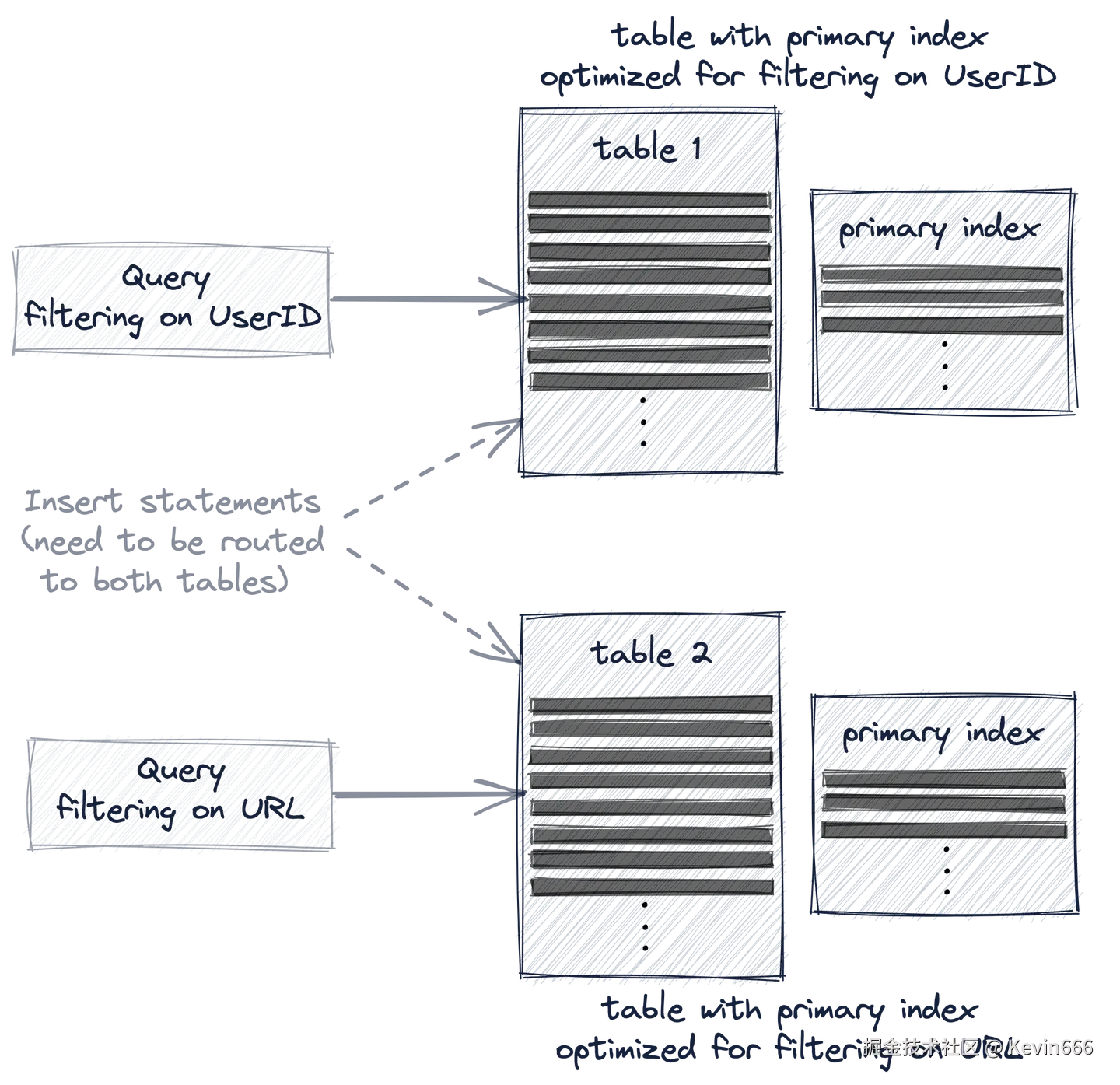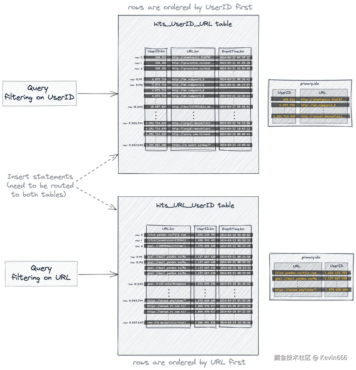现在我们有了两张表。优化了对UserID和URL的查询过滤,分别: