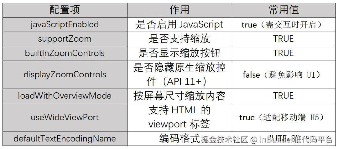 WebView的核心配置通过WebSettings类实现,初级阶段需掌握以下关键属性:
