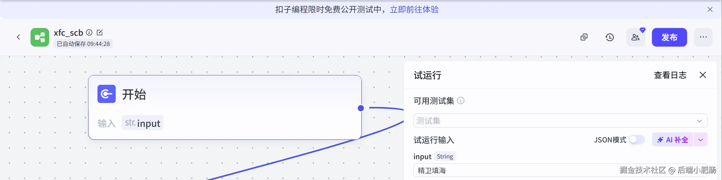 开始节点: 开始节点参数为默认的input参数,接收用户输入的儿童画报主题,如精卫填海。