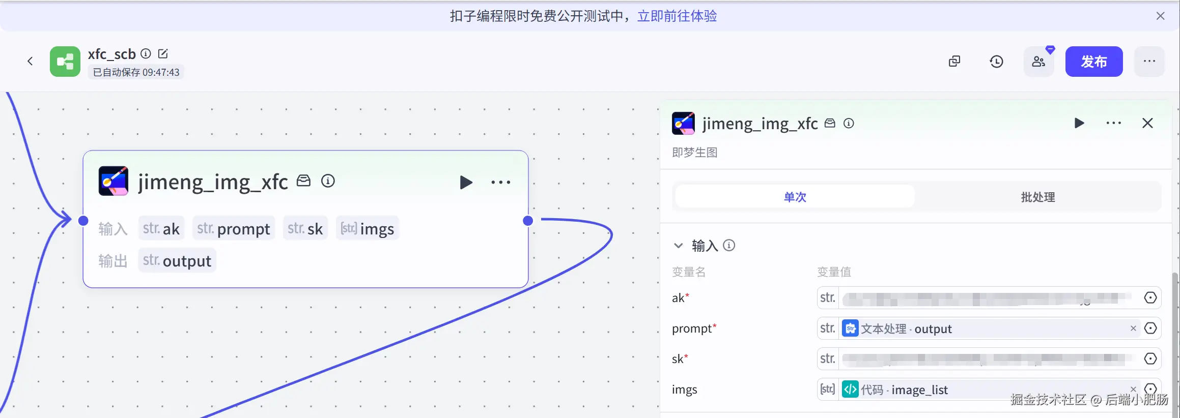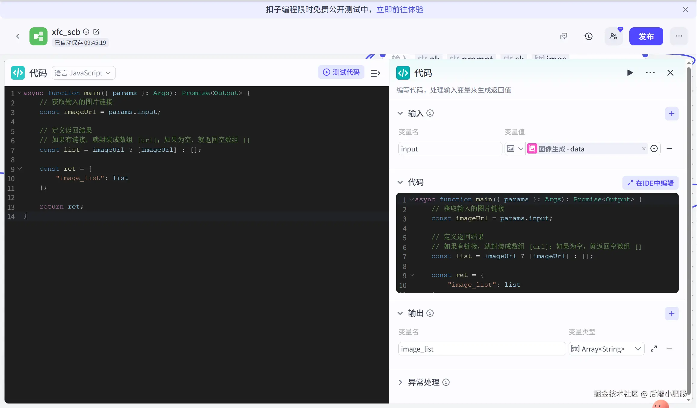 代码(将图像链接转换为数组): 图像生成节点出来后接代码节点,这个节点的作用是将图像链接转换为数组形式,这么做的目的是为了适配即梦4插件生图的格式。